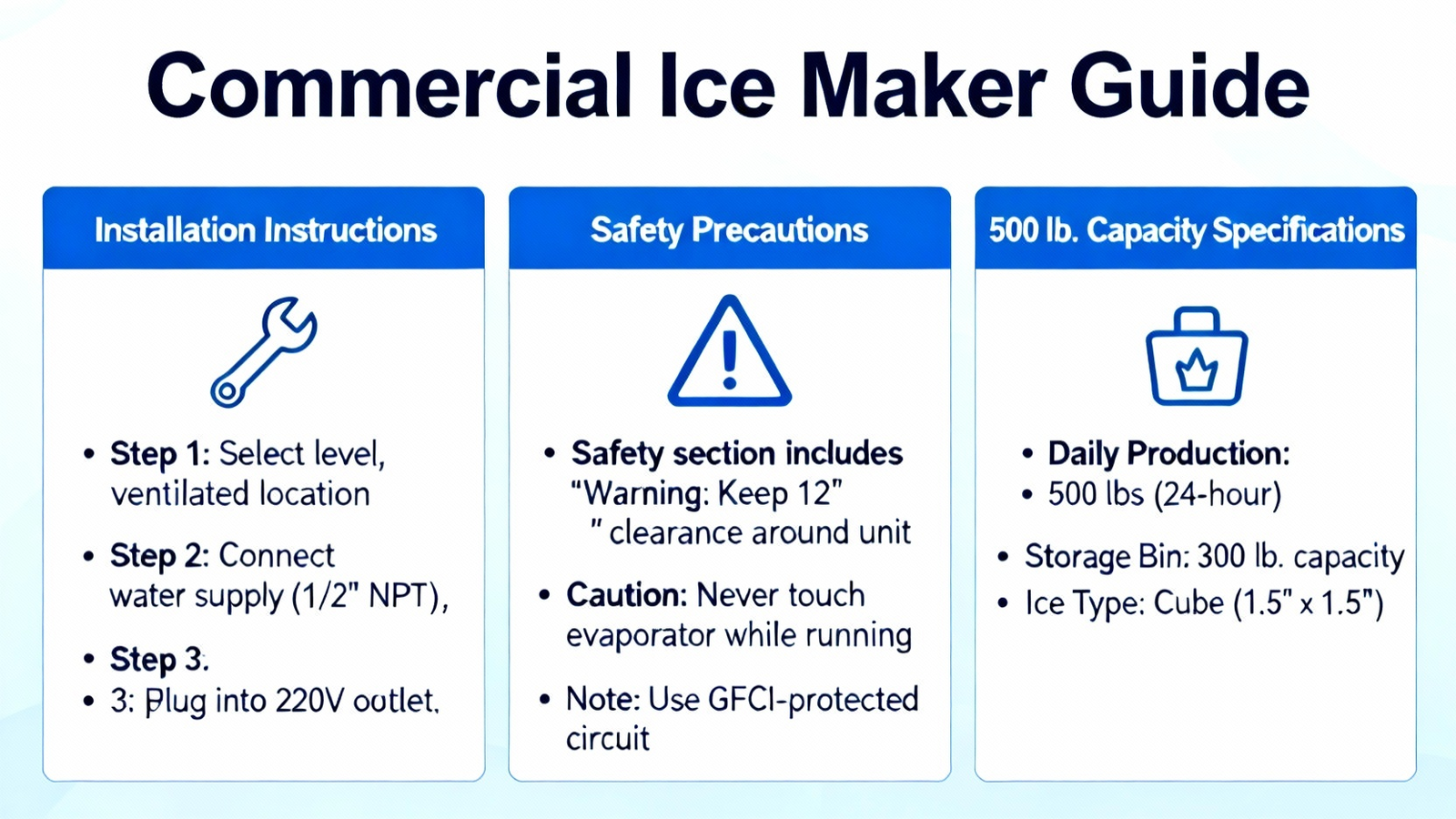 This guide is a great reminder that proper installation and safety are just as important as the 500 lb. capacity when choosing a commercial ice maker.