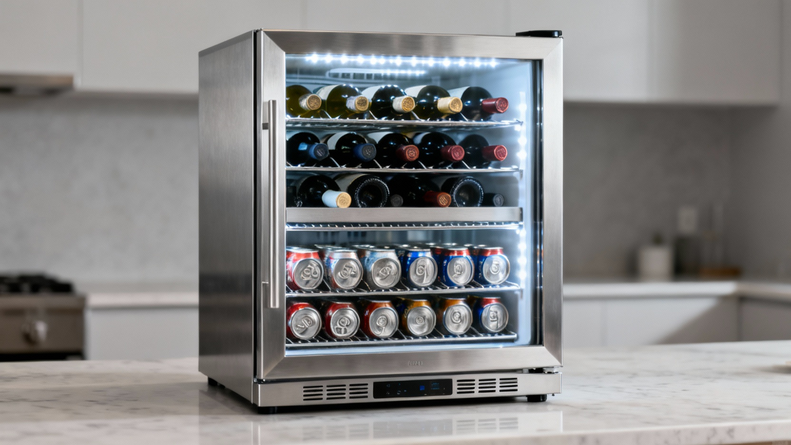 Beyond temperature, versatility in placement is crucial. This unit functions seamlessly as either a built-in appliance for a streamlined kitchen look or as a freestanding piece for a bar or entertainment area. Its interior is engineered for maximum utility, featuring nine adjustable shelves and a sturdy metal basket. This configurability allows you to easily accommodate a mix of 29 wine bottles and 88 standard cans, adapting to your needs for a large party or personal collection. The user-friendly LCD panel provides at-a-glance monitoring and easy adjustments.